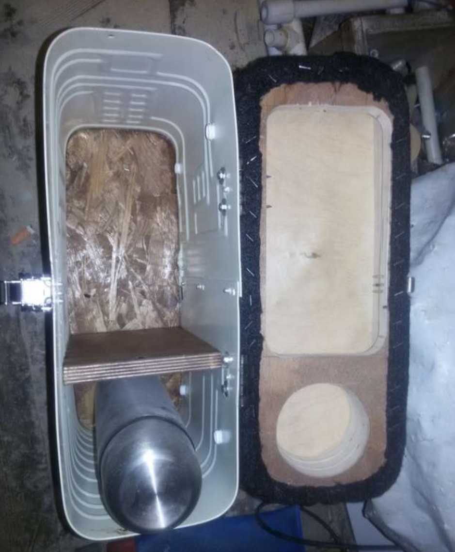 - Чтобы горячий чай и свежая рыба не перемешивались в ящике для зимней рыбалки, устанавливаем внутри поперёк ящика перегородку и вкладываем пенку для звукоизоляции термоса.