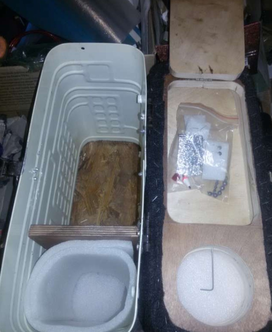 - Далее нужно сделать верхнюю открывающуюся часть из тех же материалов, что и дно. Прикручиваем шарниры, можно рояльные, можно оконные, в общем, те, которые попадутся под руку, можно и в сельмаг сбегать прикупить. А дальше начинается фантазия. Один ящик по высоте нормальный, а второй пониже, и туда не входит термос с горячим чаем, без которого на зимней рыбалке никак, а значит, нужно увеличить высоту. Для этого из той же фанеры сделал два промежуточных слоя с отверстием под крышку термоса и остальное пространство под бардачок. Крышку бардачка закрепил на мини-шарнир и прикрутил ручку – кольцо из старого дверного ключа, со стороны термоса просверлил дырку для засова, им послужил шестигранник Г-образный. Поверх крышки расположил несколько слоев пенки (поролона) и обтянул карпетом (автомобильная ткань для акустических полок, тоже лежала со времён царя Гороха), закрепил ткань при помощи мебельного степлера. Крепим крышку к основанию. Ящик почти готов.